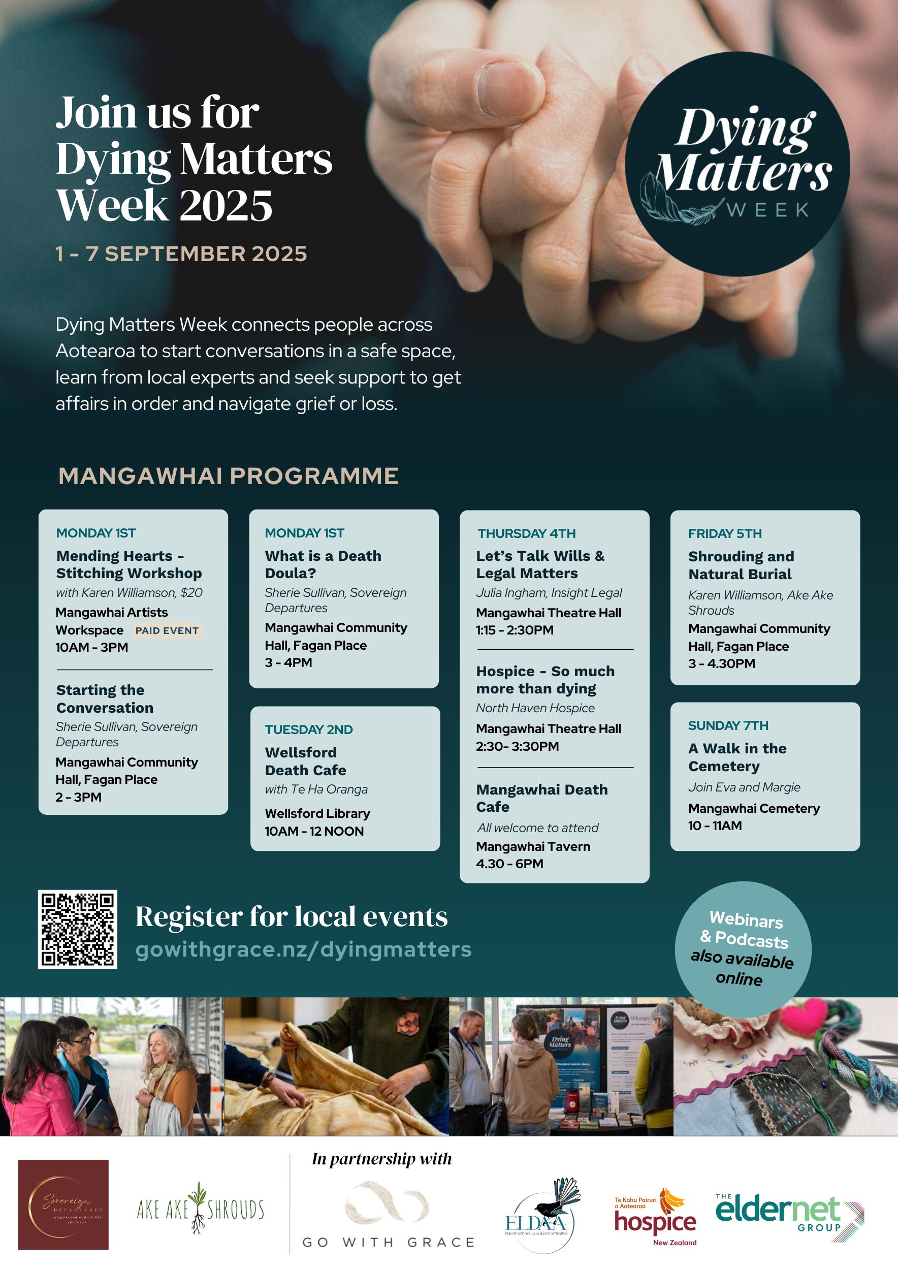 Dying Matters Week would not be possible without the hard work and dedication of end-of-life-doulas, Death Cafe facilitators, Hospice staff, Honohono Tātou Katoa and others around Aotearoa. Click on the images below to find out more about the incredible people who organised event programmes in their local towns and cities.